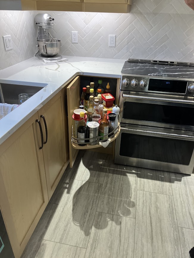 Inside the cabinets, smart accessories are what make everyday tasks easier. Pull-out garbage and recycling systems keep bins hidden but accessible, allowing you to slide them out with one motion rather than reaching into a dark cabinet. Narrow pull-outs for spices, oils, and baking ingredients turn slim spaces beside appliances or between cabinets into highly efficient storage. Utensil organizers, knife blocks, and tray dividers in drawers keep tools and cookware sorted so that everything has a home. Under-sink organizers help bring order to a space that is usually cluttered and hard to reach, turning it into usable storage for cleaning supplies and everyday items.